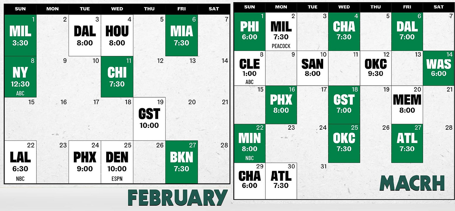 Así que juguemos a ser doctores especialistas en rehabilitación de lesiones en el Aquiles en jugadores NBA, y vayamos a buscar una fecha. A Tatum le operaron el 13 de mayo y creo que, como mínimo, hemos de pensar post-All Star, que es el tercer domingo de febrero (13-15), 9 meses fuera. Ha dicho que será un partido en casa y marzo tiene muchos, pero hay que pensar en diferentes factores: rival, calendario alrededor, exigencia. Os dejo los calendarios de final de febrero (hay un partido) y marzo.