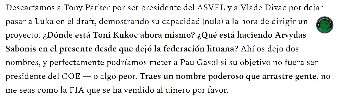 El tema de Pau Gasol, por cierto, lo dejé caer como candidato a ser comisionado de la liga en marzo del año pasado junto con los nombres de Toni Kukoc y Arvydas Sabonis. Imitando un poco lo que quisieron hacer con la BAL.