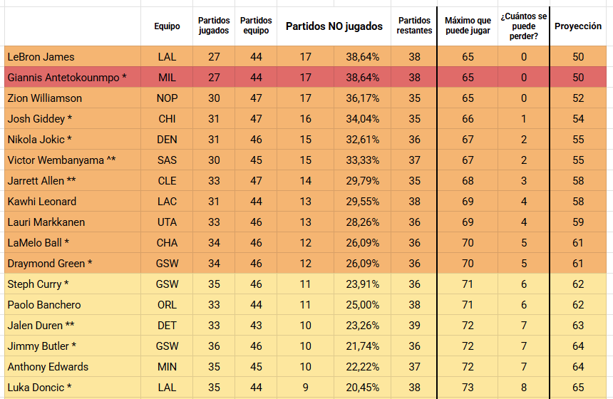 (Y cuántos partidos se pueden perder para seguir aspirando a los premios) LeBron James (0), Zion Williamson (0), Josh Giddey (1), Nikola Jokic (3), Victor Wembanyama (4), Kawhi Leonard (4), Lauri Markkanen (4), Jarrett Allen (5), LaMelo Ball (6), Paolo Banchero (6), Draymond Green (6), Steph Curry (7)