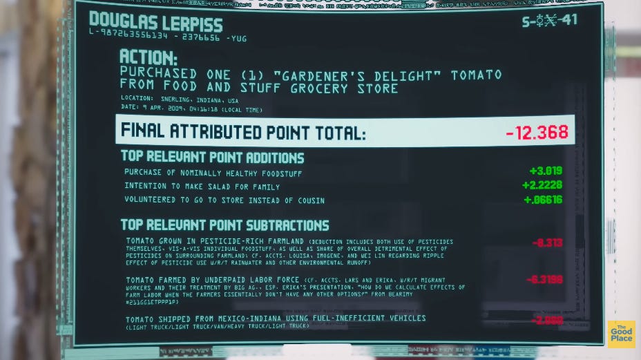 Lo que parece una buena acción tiene repercusiones negativas en la puntuación final. El hecho de comprar un tomate suma doce puntos negativos porque el tomate se plantó en una granja que usa pesticidas, y eso tiene impacto en el medio ambiente; se usó mano de obra explotada y se envió con vehículos poco eficientes en el uso de gasolina. Todo eso concluye en un -12.368 puntos para Douglas. Aunque en ningún momento el pobre Doug haya tomado la decisión de apoyar el uso de pesticida, el uso de gasolina o la explotación de mano de obra. Solo quería un maldito tomate para su ensalada.
