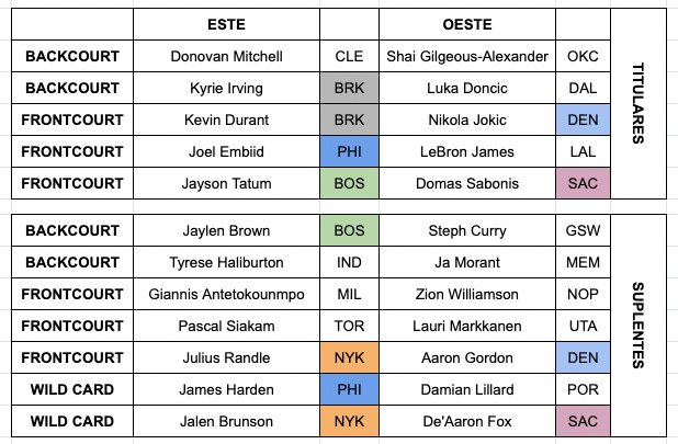 Y ahora si queréis os digo los 24 que van a ir, en el mismo orden: Kyrie, Mitchell, Giannis, Tatum, Durant (titulares); Haliburton, Jaylen, Embiid, Siakam, Butler, Brunson, Harden en el Este y Curry, Doncic, LeBron, Jokic y Zion (titulares); Shai, Ja Morant, Sabonis, Markkanen, Gordon, Lillard y Fox en el Oeste. No creo que falle más de tres.