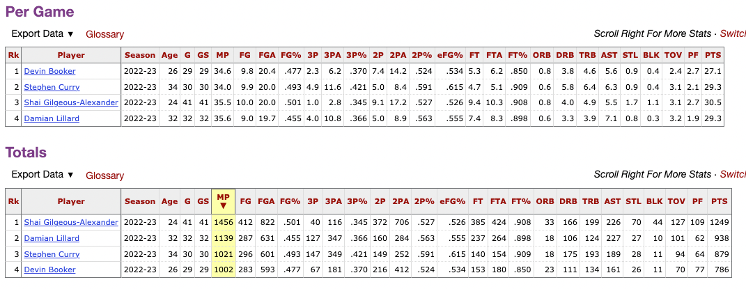 GUARDS: Luka Doncic y Shai Gilgeous-Alexander. Es seguramente la gran sorpresa, pero lo siento, Curry no es titular para mí. Y no, no tiene nada que ver con que le ganara las últimas finales a mi equipo o lo que pasara ayer a la noche (programé esto antes del partido). Es que Luka Doncic es uno de los cuatro fijos que os hablaba y Shai Gilgeous-Alexander es la gran noticia de la temporada. Del esloveno ni hay que decir nada nuevo, pero con el canadiense toca defender el argumento por encima de Curry. Sus números son similares: Steph tira mejor, Shai es mejor defensor. Curry reparte más asistencias y rebotes, SGA anota más y va mucho mejor a la línea. En el récord hay medio partido de diferencia y creo que el punto diferencial es la disponibilidad: Shai ha jugado 400 minutos más (11 partidos) que Steph. Son demasiados.