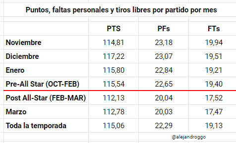 en su esta semana un artículo donde asegura que desde las franquicias se cree que la NBA ha cambiado la normativa a mitad de temporada, y hay motivos para creerlo.Entre noviembre y enero, el promedio de puntos anotados en la NBA se mantuvo en 115,5, con un pico de 117,2 en diciembre (el último mes sano de Embiid). Y las faltas personales se mantenían alrededor de las 19,5 con una cifra por debajo de 23 tiros libres por partido por equipo. Coincidió con el apogeo anotador, dos jugadores por encima de 70, equipos metiendo 150 como si fueran los nuevos 100 y el Este, en el All Star, superando la barrera mágica de los 200 puntos. Hay un límite ético y seguramente fue ese, un punto de no retorno para la NBA si no se hacía nada al respecto. El talento ofensivo está en el mejor momento de su historia, pero las defensas han sido tan reguladas que por momentos no pueden coexistir.