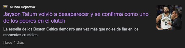 Jayson Tatum no es clutch. Esa frase la hemos leído, escuchado y visto mil veces en el último mes, con datos de tiro, con porcentajes de acierto, puntos por cuarto y otros números para reforzar una idea. Y nos lo han repetido tantas veces que al final, por presión social, insistencia y constancia, nos la hemos creído. Nos hemos creído que Tatum no es clutch, que no aparece en los partidos importantes, que es un pecho frío y que con él como estrella los Celtics nunca ganarán un anillo. Nos lo hemos creído con la boca abierta, como si fuera la verdad absoluta, sin importar el resto. Y vengo a demostrar como una mentira contada 1000 veces no se convierte en una verdad, pero os la creéis.