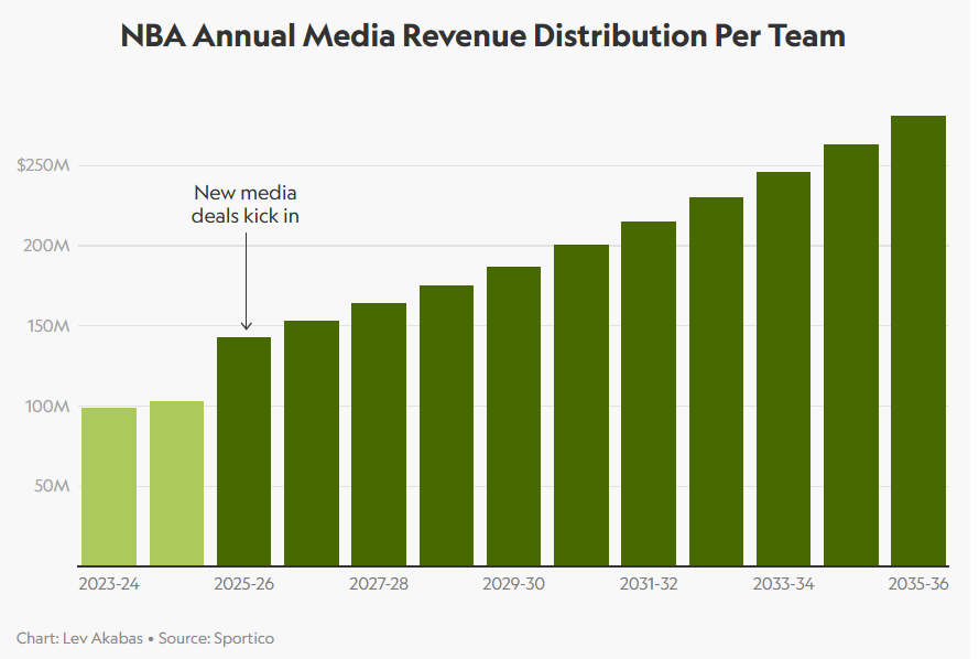 Mucha gente argumenta que se debería haber acordado antes de firmar el nuevo acuerdo de TV por 76 mil millones de dólares, y que hacerlo ahora es imposible. ESPN, NBC, Amazon Prime o DAZN en España no tendrían menos partidos, su cantidad no tendría por qué cambiar lo más mínimo. Ellas mantendrían todos los que hacen. Las principales afectadas serían las televisiones locales, que tampoco son un ingreso masivo para los equipos, y poco a poco están muriendo. El año pasado representaron el 10% del ingreso total en la liga, bajando la cifra de años anteriores, y porque lo inflan los Lakers con su acuerdo de $200 millones.
