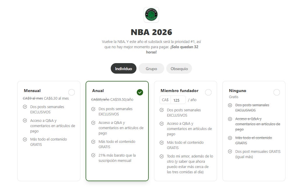 Y por eso te traigo un regalo, una oferta. Un 30% de descuento en tu suscripción durante un año en cualquiera de los planes (mensual, anual…). Puedes pagar mensual o cancelar a los dos meses, que el 30% lo tendrás igual. La oferta es válida durante el fin de semana, hasta que acabe la jornada NBA del domingo. Con ella tendrás acceso a todo lo que suba, desde los artículos y pódcasts (puntuales) a bases de datos, historias diferentes y una forma de entender la NBA más allá de los resultados.