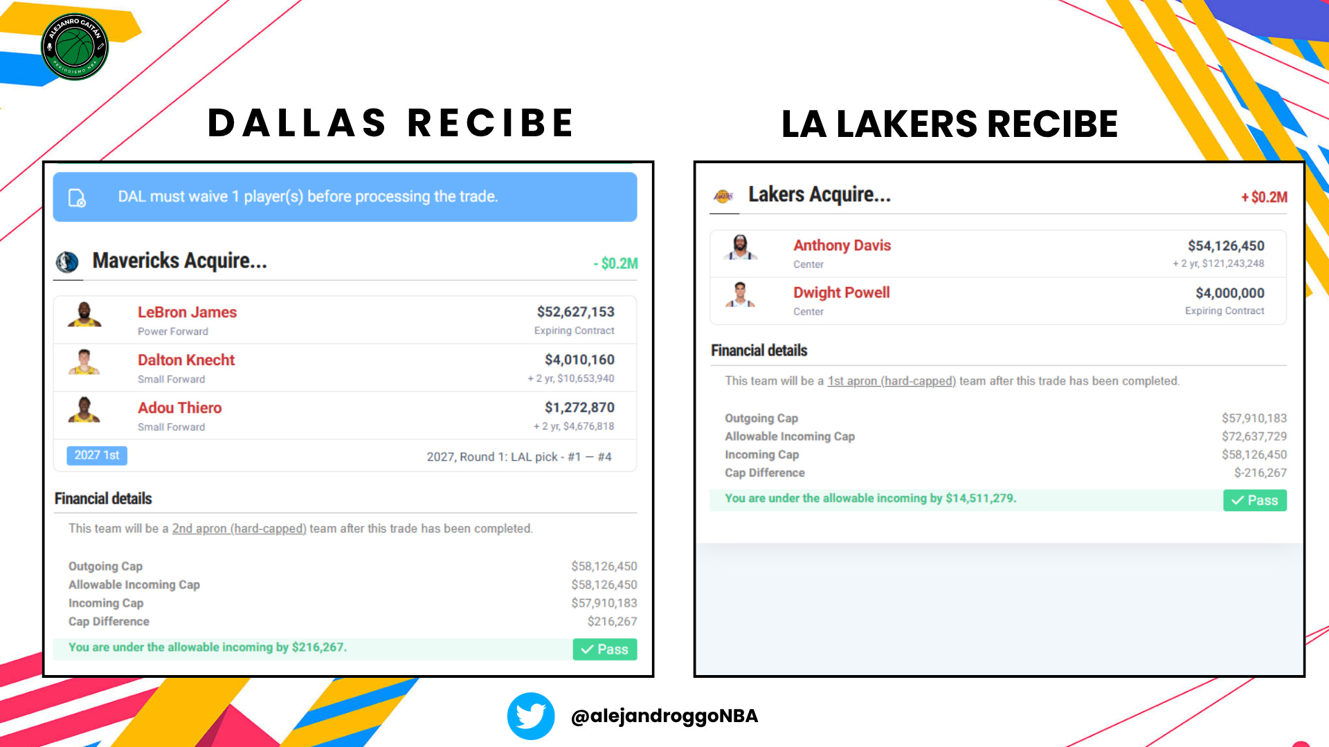 Anthony Davis y Dwight Powell x LeBron James, Dalton Knecht, Adou Thiero y le quitan la protección a la primera ronda de 2027 que enviaron en el traspaso de Luka (os prometo que he intentado meter a Bronny, pero no sale).