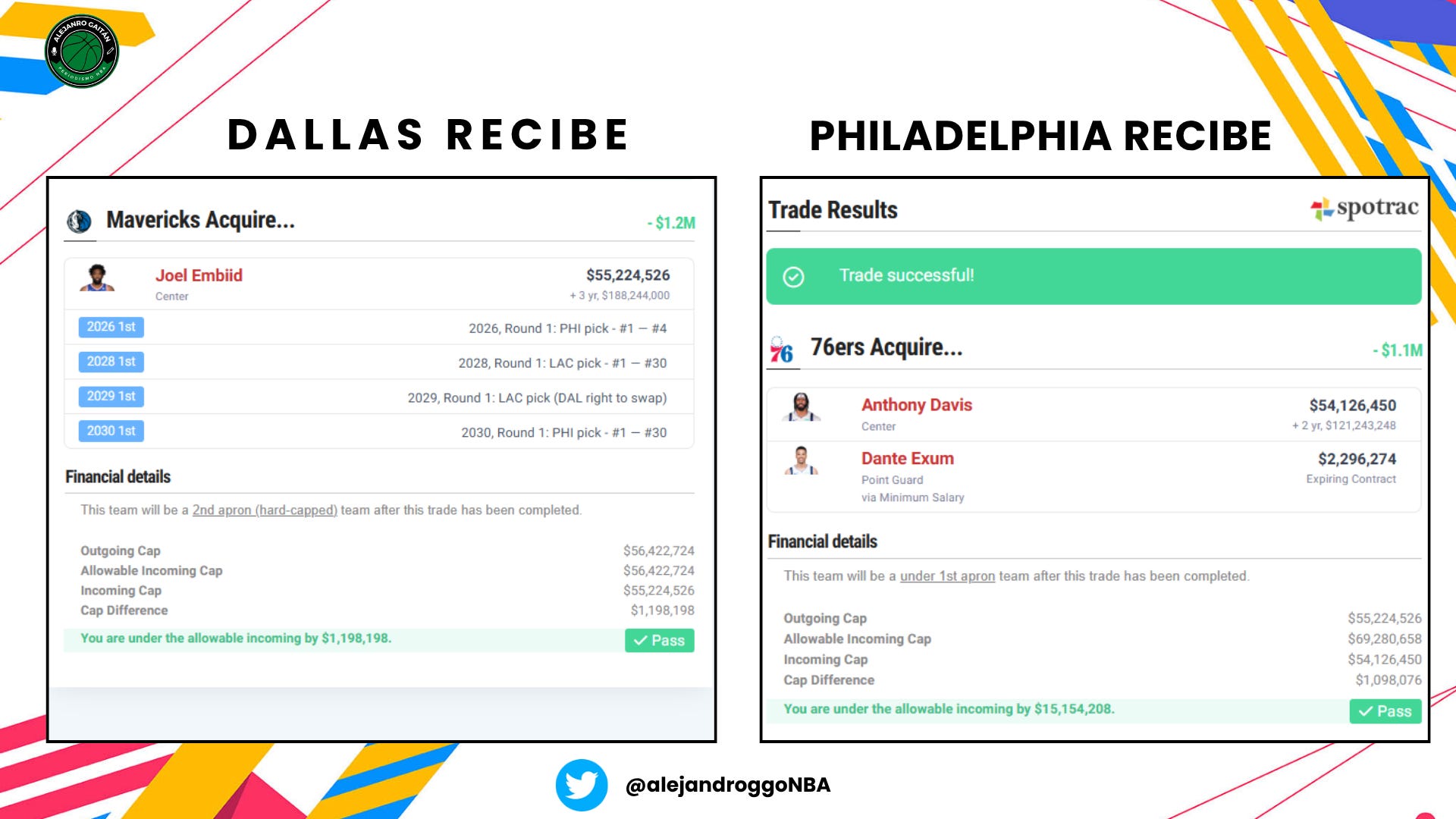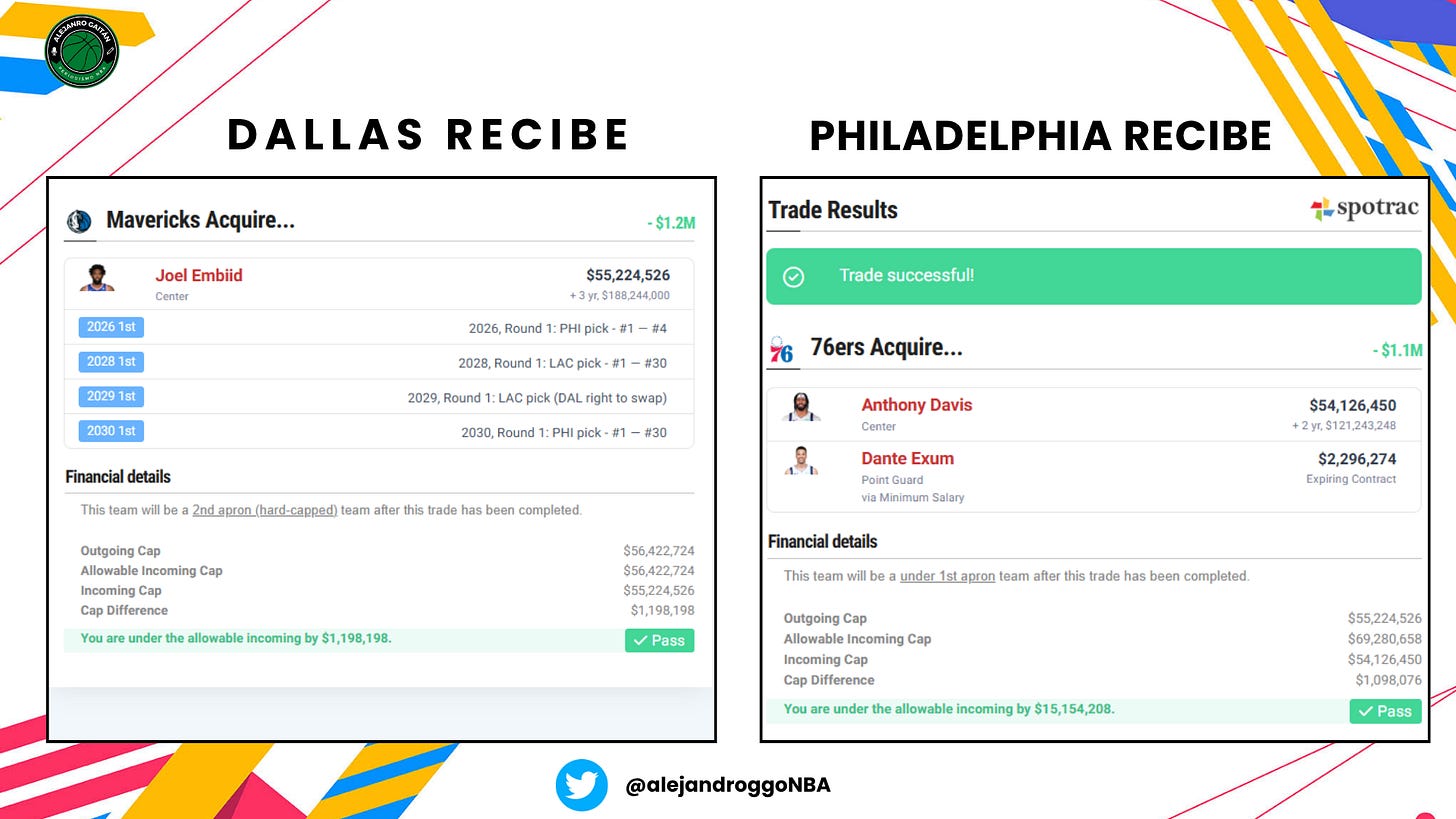 Anthony Davis y Dante Exum x Joel Embiid más 4 primeras rondas: la de 2026 (vía PHI, pero solo #1-4), la de 2028 (vía LAC), un swap de 2029 (vía LAC) y sin protecciones en 2030.