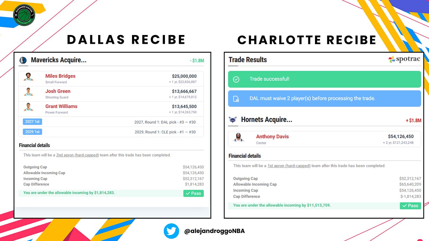 Anthony Davis x Miles Bridges, Josh Green, Grant Williams, recuperan la primera ronda de 2027 que mandaron por PJ Washington y la primera ronda de 2029 (vía CLE)