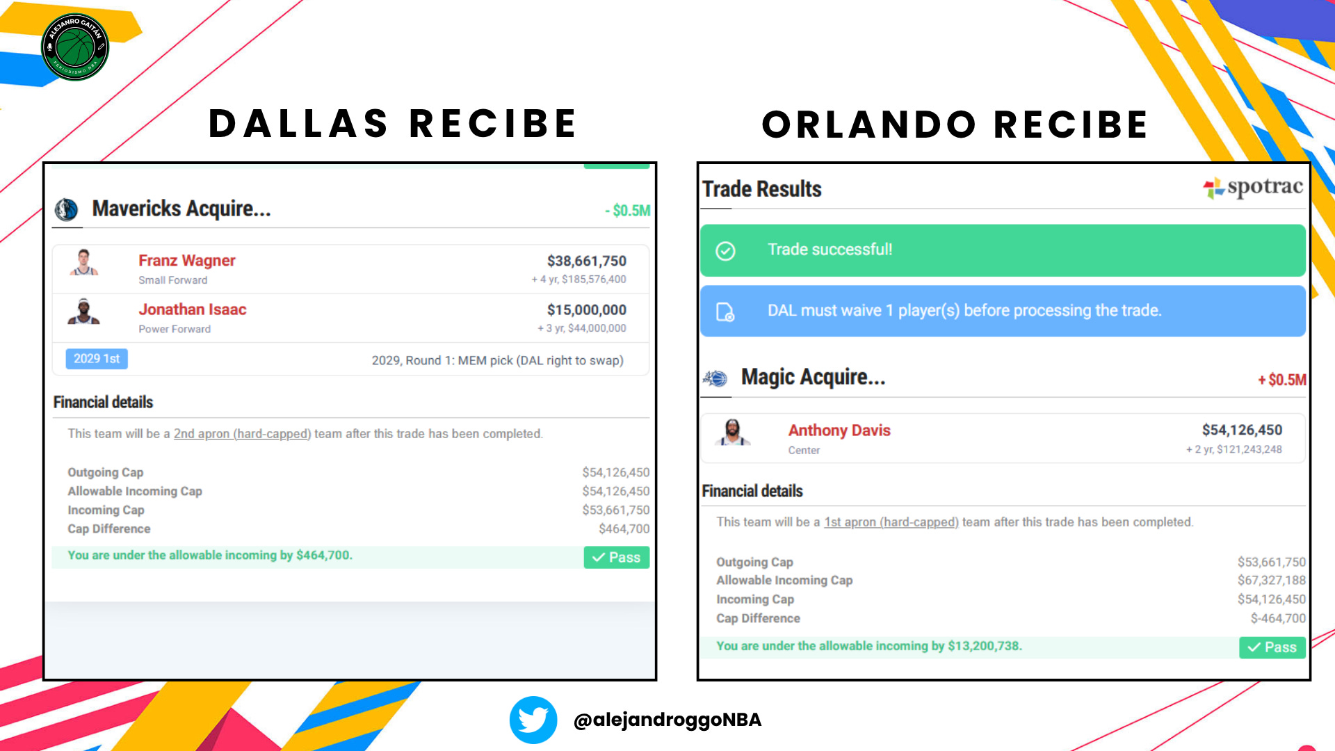 Por eso, sobre la mesa tiene que estar la opción, la idea, la hipótesis de, al menos, pensar en mover a Anthony Davis. Sé que no será lo primero que Michael Finley y Matt Riccardi vayan a hacer al iniciar su legislatura como co-general managers, que hay tareas más urgentes. Pero como me considero una buena persona, una que quiere ayudar, les dejo aquí algunas ideas para que no tengan que perder el tiempo llamando a las 29 franquicias. Y con algunas ideas me refiero a doce traspasos que podrían hacer los Mavericks para mover a Davis ya mismo.