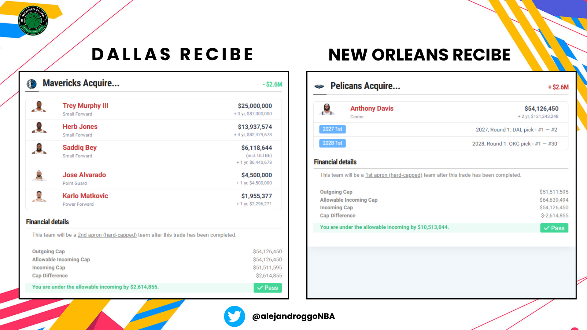 Anthony Davis, la primera de 2027 (solo #1-2) y la primera ronda de 2028 (vía OKC) x Trey Murphy III, Herb Jones, Saddiq Bey, Jose Alvarado y Karlo Matkovic
