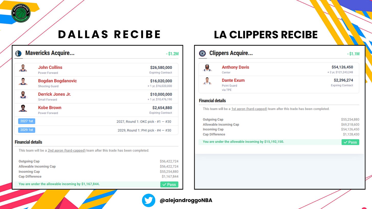 Anthony Davis y Exum x John Collins, Bogdan Bogdanovic, Derrick Jones Jr, Kobe Brown, la primera ronda de 2027 (vía OKC) y la de 2029 (vía PHI, protegida top-3)