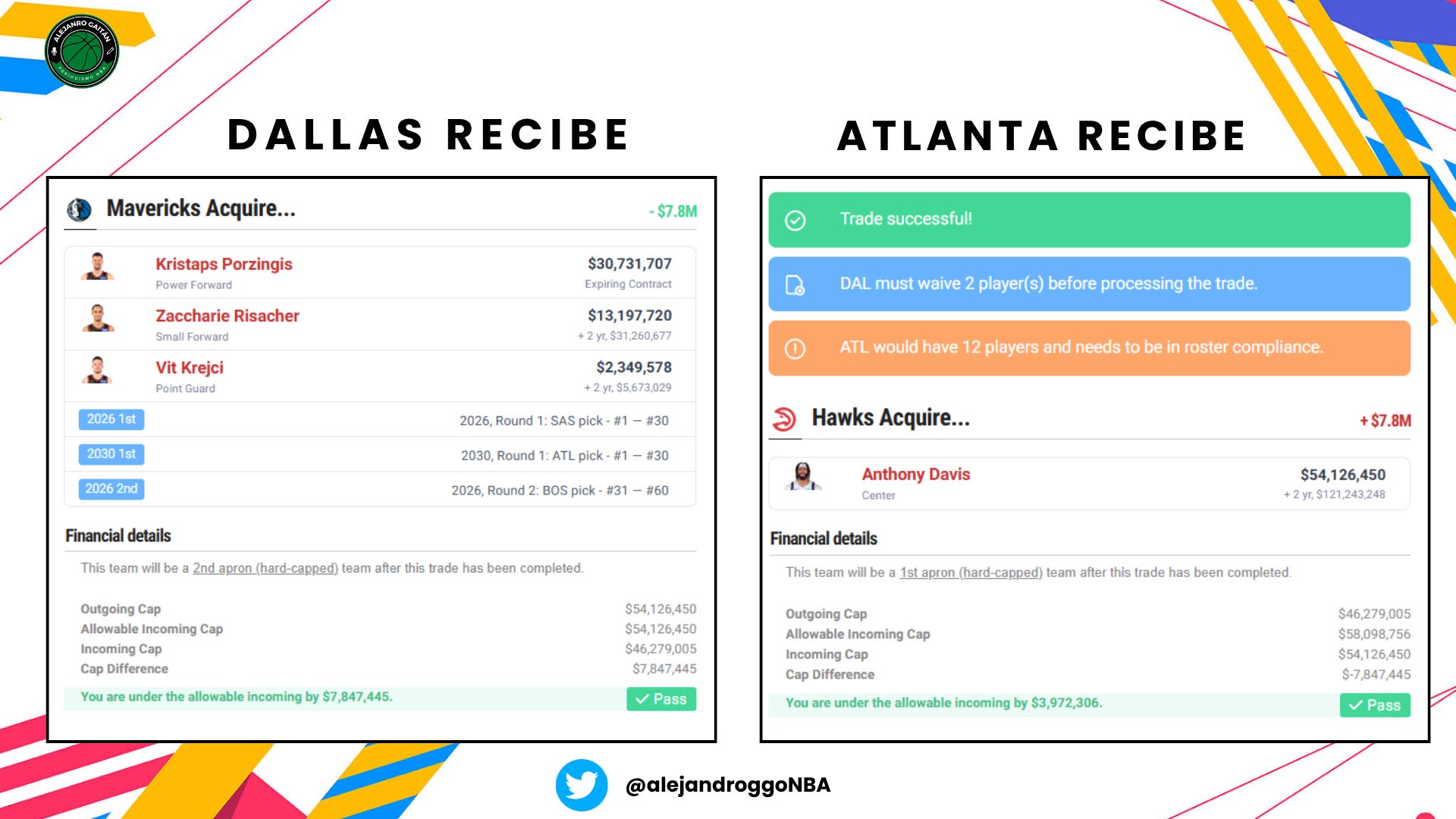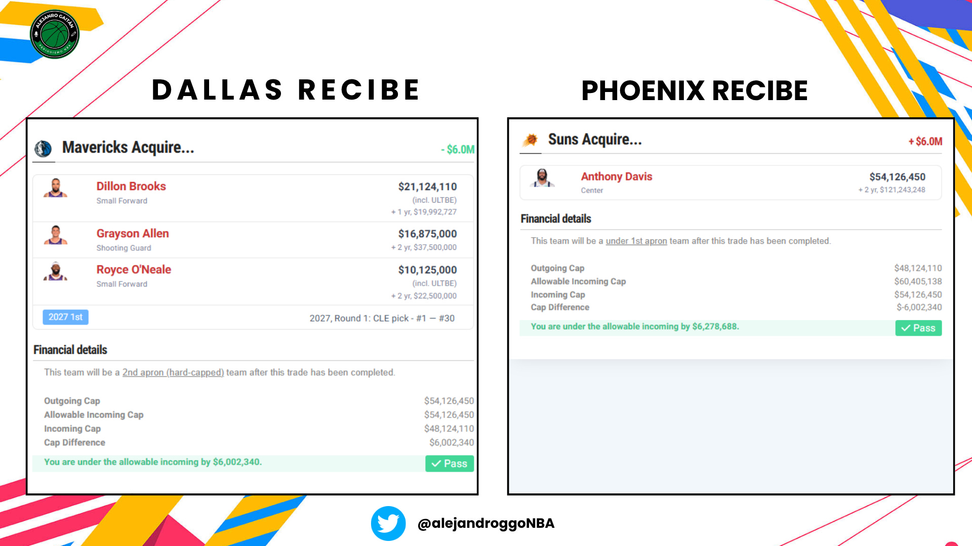 Esta es, sin ninguna duda, mi oferta favorita. Tanto por realista, como por la oportunidad de enviar a Davis a un equipo donde si las cosas salen bien, podría intentar competir por algo. Me ha costado una barbaridad hacerlo que funcione, pero bueno. Dallas recibe un base, un pívot para poder traspasar a Gafford la semana siguiente (o previa) y tres primeras rondas: Murray-Boyles, 2027 y el swap de 2029. Es un buen paquete, sobre todo si mover a Kyrie está sobre la mesa. Añadir a AD a un equipo con Scottie, Ingram y RJ Barrett me parece al menos interesante.
