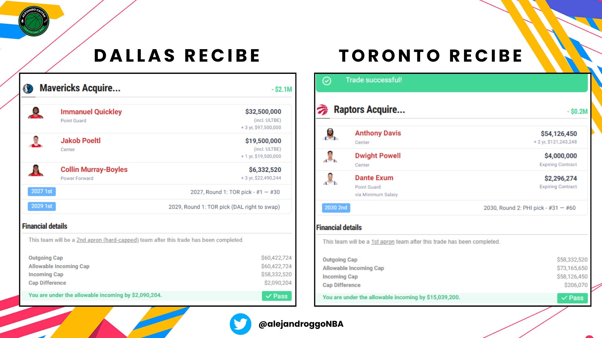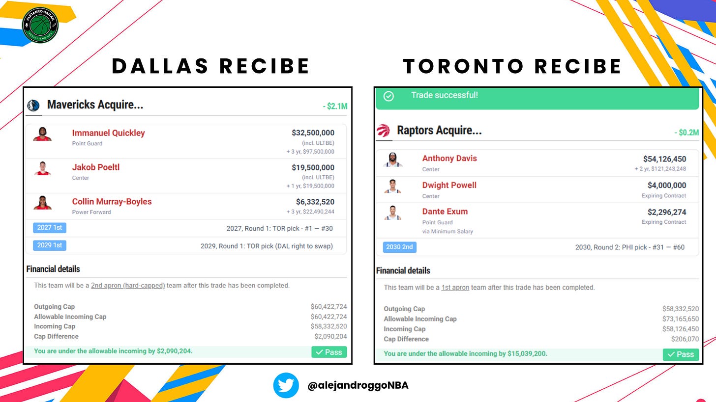 Anthony Davis, Dwight Powell, Dante Exum x Immanuel Quickley, Jakob Poeltl, Collin Murray-Boyles, la primera ronda de 2027 y un swap de primera ronda en 2029.