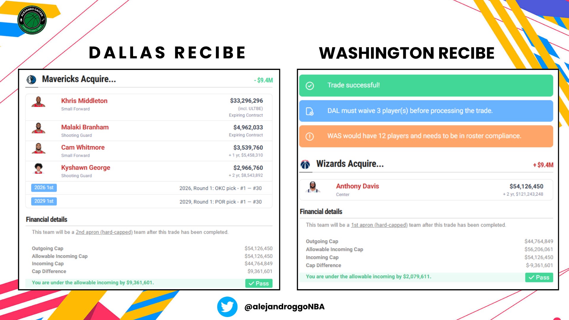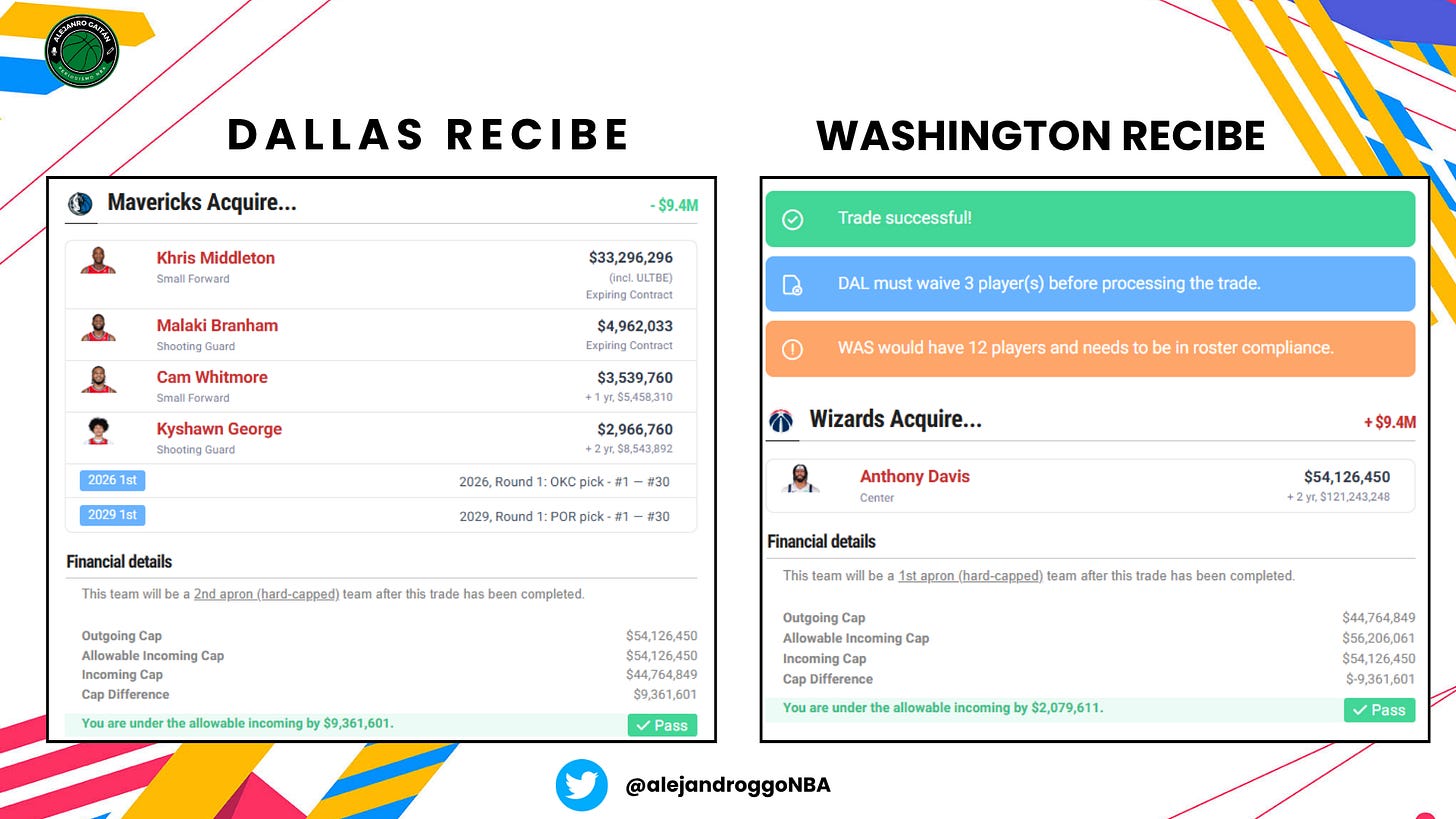 Bastante parecida al escenario de los Bulls el paquete que recibe Dallas, pero con un pequeño añadido: dos jóvenes. Middleton y Branham son expiring, pero llegan también Cam Whitmore y Kyshawn George (que es el tercer mejor canadiense del mundo ahora mismo), junto a dos primeras rondas por Anthony Davis. La llegada de un bastión defensivo empezaría a darle identidad a un equipo que lleva un lustro diciendo que ahora sí, ahora sí, pero al final otro año que no porque nunca tienen talento suficiente. AD es talento suficiente junto al puñado de jóvenes que viven en la capital.