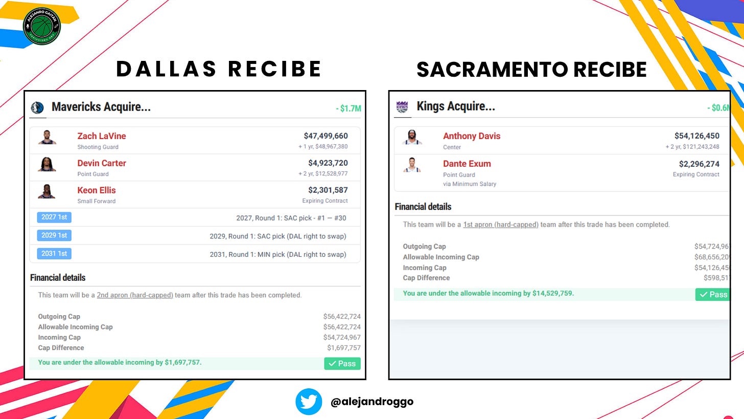 Todo apunta a que los Kings se dirigen a otra reconstrucción. Del proyecto que tocó techo al pisar playoffs ya solo queda el recuerdo y Domantas Sabonis. Pero si hay algo que se le da bien a Sacramento, y se vio en el trade de Fox x LaVine, es huir hacia delante. Se deshacen de LaVine por alguien que tiene un contrato más grande, pagando además varias primeras rondas (1+2 swaps) y dando a su mejor defensor en el proceso, Keon Ellis. Es un traspaso en el que salen perdiendo todos a corto plazo, pero donde los Mavs pueden llevarse algo con los intercambios de final de década. Pensadlo bien.