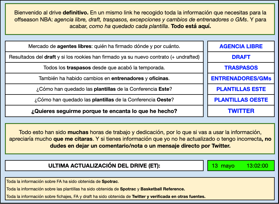 Se acabó la temporada NBA. Los Thunder de Shai Gilgeous-Alexander se proclamaron campeones por primera vez en la historia de la ciudad, ganando en siete ante Indiana. Pero hace ya más de 24 horas de eso, y en el deporte, una noche entera son como siete años humanos. El anillo ya es pasado y el presente y futuro es el mercado NBA, o sea, mi parte favorita del año. Y como cada verano, tengo un Google Drive con TODA LA INFORMACIÓN en una misma página. Y desde aquí vas a poder acceder a él en exclusiva. Pero antes, déjame explicarte qué vas a encontrar y hacer un poquito de spam.