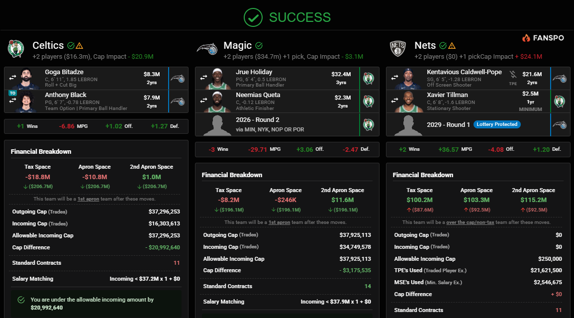 El base está para ir a un entorno competitivo donde necesiten un generador que tire bien y que mantenga el nivel defensivo, y habrá candidatos seguro. Pero además, que aporte experiencia. Por ejemplo, Orlando Magic. Le mandas a Florida que no tiene impuestos. A cambio te llevas a Bitadze y Anthony Black en un movimiento a tres bandas donde los Magic se liberan del sueldo de Kentavious Caldwell-Pope, rumbo a Brooklyn (que lo moverán en febrero por otra ronda). Metemos un par de rondas, a Queta y Tillman para que encaje a nivel financiero y ya tenemos el primer movimiento que le ahorra a Boston $20,9 millones. Como sale del segundo apron (-$19.9 millones) pueden añadir salarios en el traspaso.