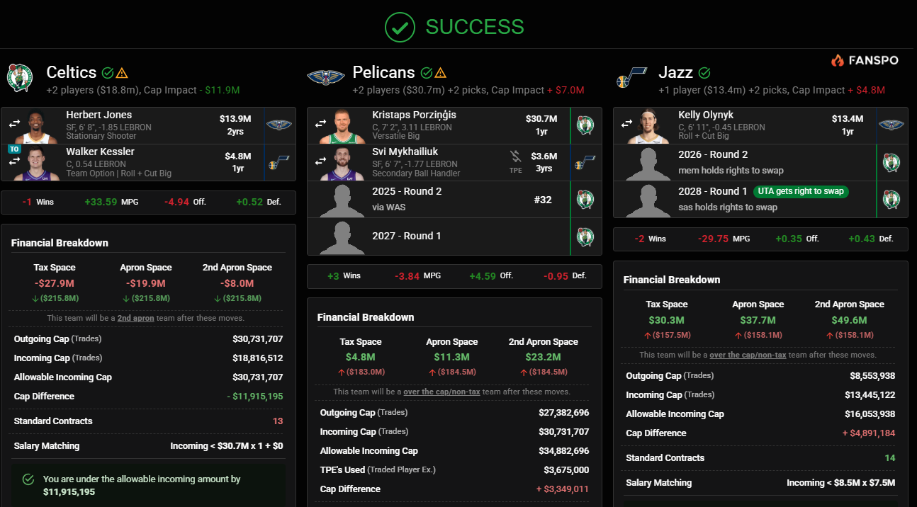 Nota al pie: todos los traspasos han sido aprobados por la trade machine de Spotrac, la única fiable en el mercado, pero la de FanSpo tiene mejor visualización del resultado.