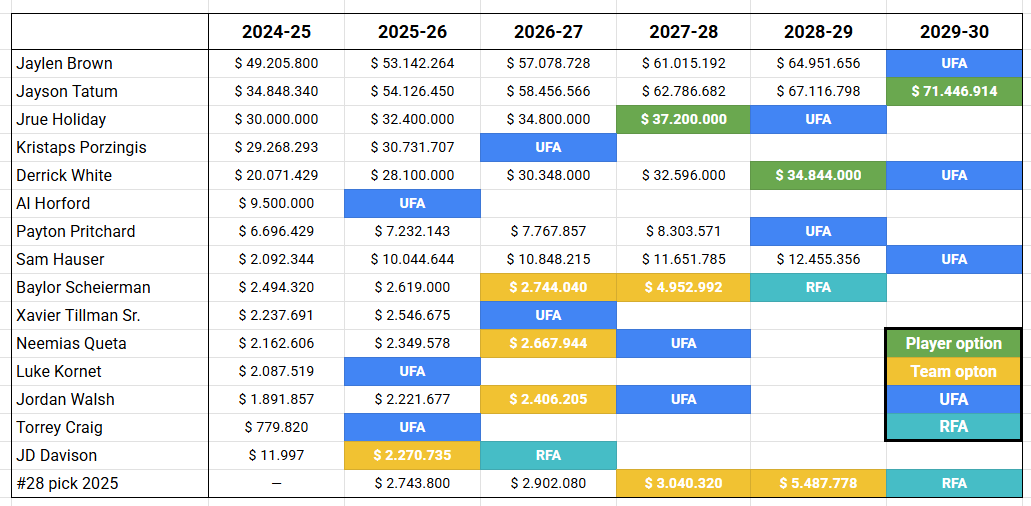 Entre las sanciones deportivas destaca el no poder agregar jugadores en traspasos, recibir más dinero del que envía en un traspaso, firmar buyouts, realizar sign and trades o usar una TPE. Además, y esto es importante, el pick de primera ronda siete años después de haber estado por encima del segundo apron queda congelado y no puede ser traspasado (2032 ahora mismo). Para descongelarlo, un equipo tiene que bajar del segundo apron en tres de los próximos cuatro años (lo expliqué todo más en detalle en Gigantes, por si queréis leerlo luego). Boston está por encima de todos ellos únicamente con los doce jugadores que tiene bajo contrato más el contrato del pick #28 del próximo draft, que los Celtics pueden usar para un jugador joven.