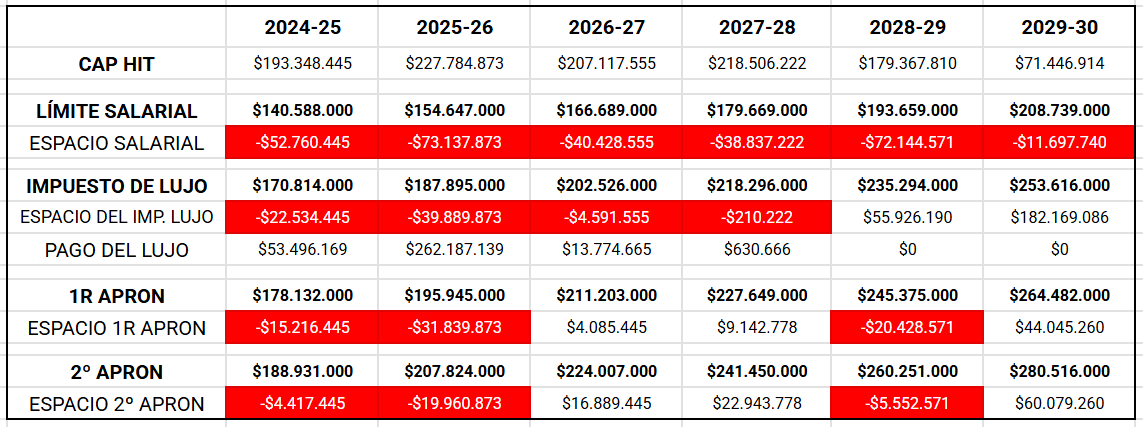 Segundo apron: $207.824.000 (segundo y último límite salarial, con más sanciones deportivas).