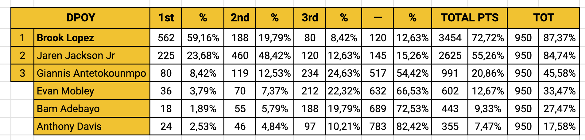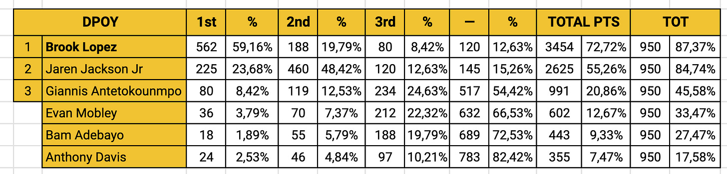 El premio al mejor defensor del año. Otro peleado. Habéis votado por Brook Lopez por delante de Jaren Jackson Jr y Giannis, que sorprendentemente, es el mismo ballot que tengo yo. Igualado, con Brook y JJJ a semanas de distancia del resto, pero muchos preferís al interior de los Bucks. Los cinco (o seis) son PF/C, como para pensar en Claxton, que se lo merecería como cualquier otro.
