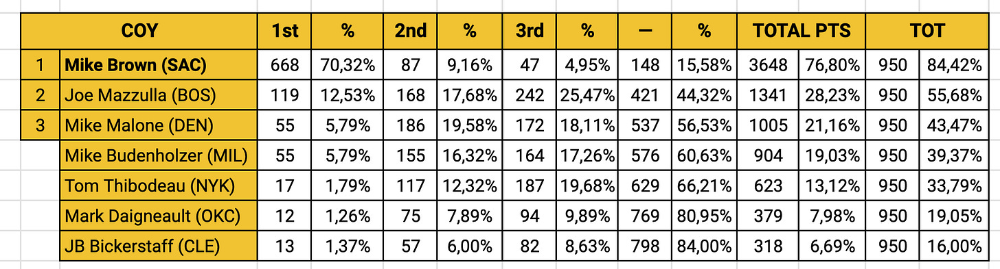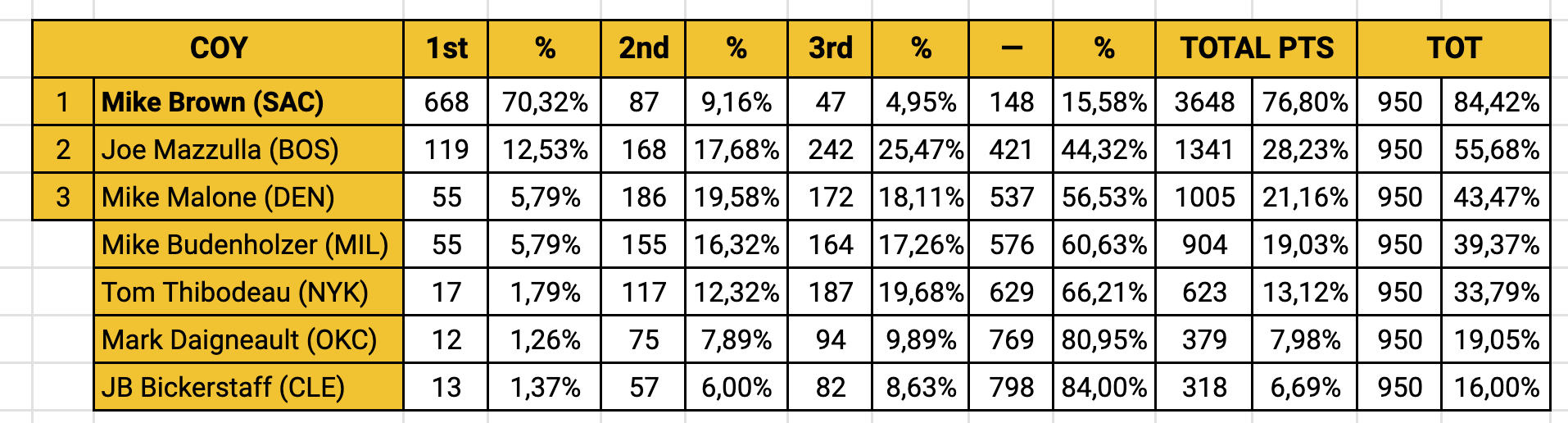 Vamos a ir de menos a más, como la telenovela de los Mavericks en el último tramo de la temporada. Porque este año hay premios que sabemos desde febrero quién los va a ganar, y otros que igual no se han decidido todavía. Pero primero explico rápidamente cada cuadro: podéis ver cuantos votos ha recibido cada jugador/entrenador en cada posición y el porcentaje de los votos. Cuando pone — es que no ha recibido votos. Al final, las dos columnas bajo TOTAL PTS son los puntos totales y el porcentaje de puntos sobre el total que podía haber recibido si hubiera tenido solo votos como #1 y bajo TOT cuantos votos ha habido y el % de gente que les ha votado. Importante recordar que los nombres los saqué de las casas de apuestas, siendo los máximos favoritos, no los elegí a dedo.