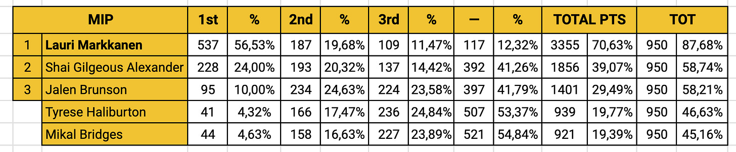 El premio al jugador más mejorado del año. Muchos habéis votado lógicamente a Lauri Markkanen, que ganará. Me sorprende (a mí, claro) lo de Shai porque yo no entiendo el premio así, pero es probable que el canadiense quede segundo, aunque habrá pelea con Jalen Brunson. Igual, el premio ya debería estar camino al Ejército de Finlandia.
