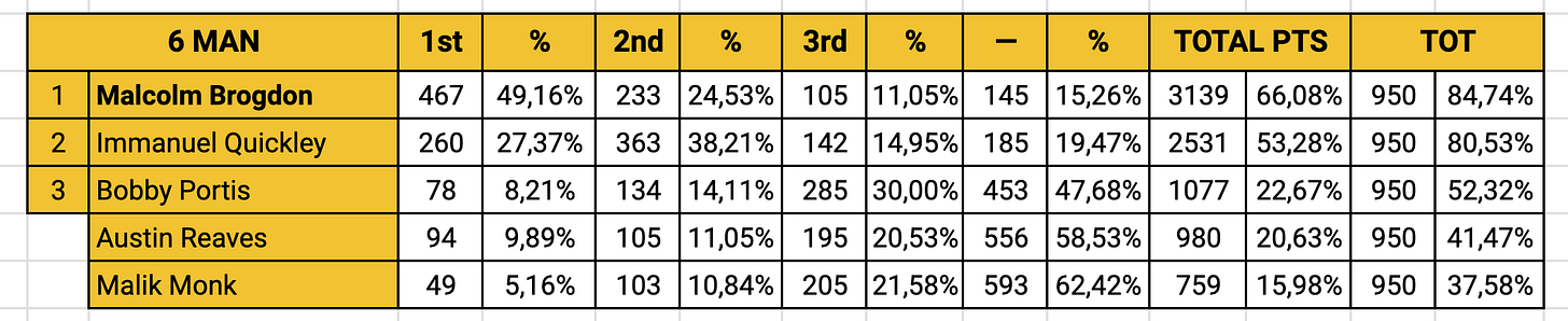 El premio al mejor sexto hombre del año será de los más discutidos, aunque en la democracia paralela que hemos montado en Twitter, no ha sido tan así. Malcolm Brogdon ha ganado por 200 votos y 600 puntos por delante de Immanuel Quickley. Todo apunta a que ellos se lo jugarán y según se ha ido filtrando, el de los Celtics parece que será el ganador con Portis tercero. Es probable que este premio lo clavemos al 100%.