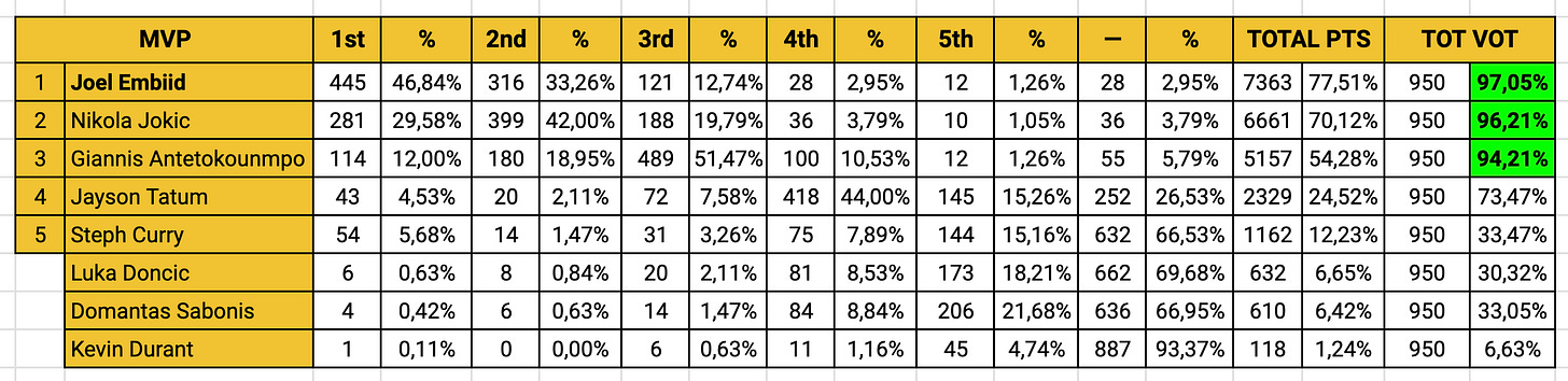 El premio al jugador más valorado de la temporada. El debate que llevamos meses teniendo. Se lo habéis dado a Joel Embiid y por muchísimo, con un 47% de los votos en primera posición (por 30% de Jokic y 12% de Giannis). Embiid ha conseguido un 7.5% más de puntos que el serbio, aunque está aquí más igualado de lo que parece que estará en la realidad. No quiero ni entrar a hablar de lo psicópatas que habéis sido votando a Tatum (43) o Curry (54) primeros, pero al menos el top-3 tiene sentido. Cualquier orden entre ellos tendría sentido, la verdad.