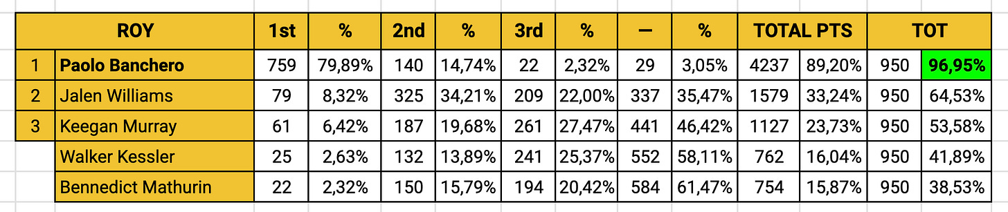 El premio al mejor novato del año debería ser también unánime, pero Andy Larsen ya ha votado por Walker Kessler. Igualmente, en nuestro caso, Paolo Banchero se llevó casi el 80% de los votos en primera posición y solo un 3.05% de vosotros no le votasteis (29/950). Mi pregunta para vosotros es, ¿qué cojones os pasa? Jalen Williams segundo, a años luz, y Keegan Murray tercero.